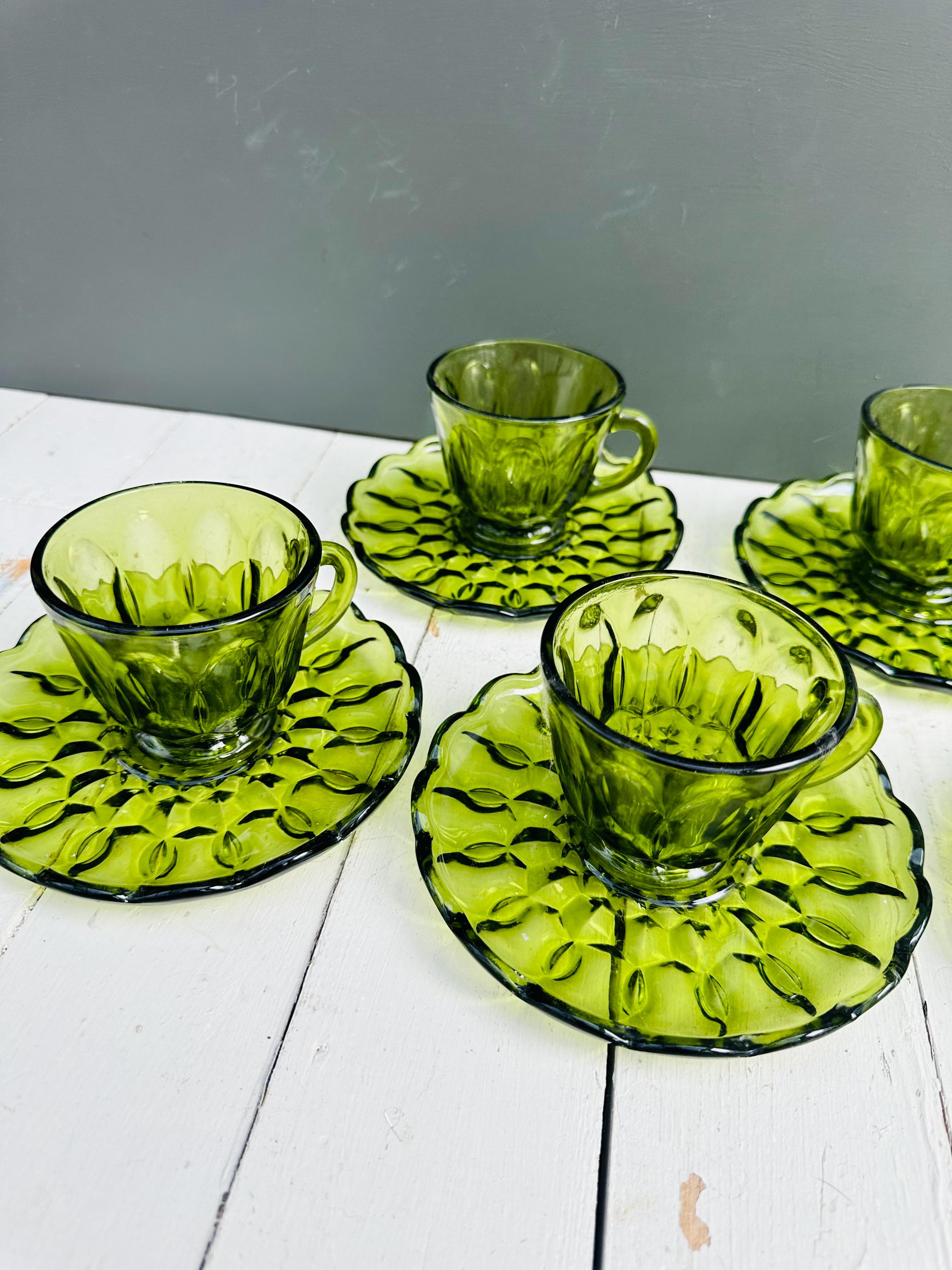 Vintage 70s Anchor Hocking Fairfield Plate and Cup Set of Five Olive Green Pressed Glass Cup and Saucer Retro Glassware Vintage Barware