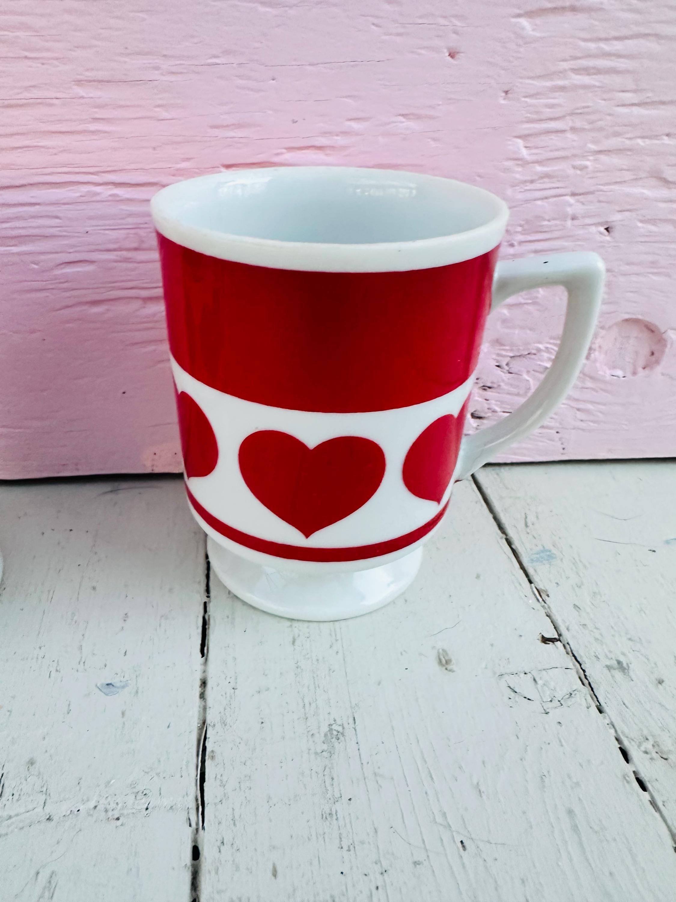 Vintage pair of Lefton coffee mugs. They feature red hearts on a pedestal style cup. Fully ceramic with no chips or cracks. The cups measure 3.75" high, 4" wide and 2.75" in depth.